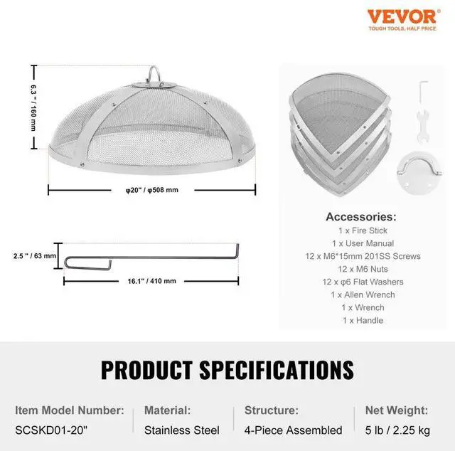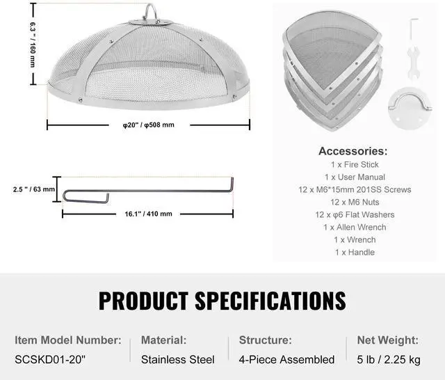 Interior Dimensions: 18.8 x 6.3 inch / 478 x 160 mm,Item Model Number: SCSKD01-20",Material: Stainless Steel,Mesh Wire Diameter: 0.03 inch / 0.8 mm,Mesh Hole Diameter: 0.08 inch / 2 mm,Structure: 4-Piece Assembled,Product Dimensions: 19 x 6.3 inch / 485 x 160 mm,Diameters: 20 inch / 508 mm,Net Weight: 5 lb / 2.25 kg,Fire Poker Dimensions: 16.1 x 2.5 x 0.2 inch / 410 x 63 x 6 mm