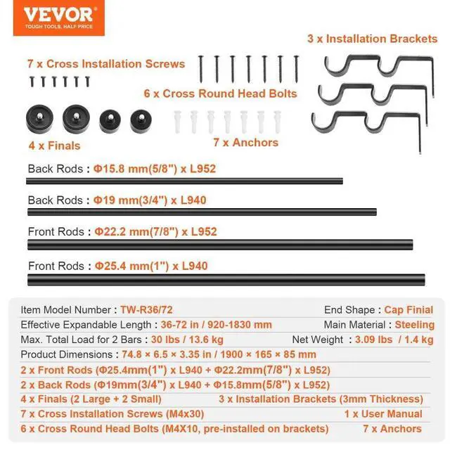 Net Weight (Including All Accessories): 3.09 lbs / 1.4 kg,End Shape: Cap Finial,Item Model Number: TW-R36/72,Effective Expandable Length: 36-72 in / 920-1830 mm,Product Dimensions: 74.8 x 6.5 x 3.35 in / 1900 x 165 x 85 mm,Max. Total Load for 2 Bars: 30 lbs / 13.6 kg,Main Material: Steel