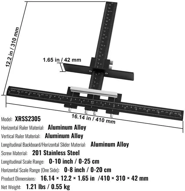 Longitudinal Backboard/Horizontal Slider Material: Aluminum Alloy,Item Model Number: XRSS2305,Screw Material: 201 Stainless Steel,Product Dimensions (L x W x H): 16.14 x 12.2 x 1.65 in /410 x 310 x 42 mm,Vertical Ruler Material: Aluminum Alloy,Longitudinal Scale Range: 0-10 inch / 0-25 cm,Horizontal Ruler Material: Aluminum Alloy,Net Weight (Including all accessories): 1.21 lbs / 0.55 kg,Horizontal Scale Range (One Side): 0-8 inch / 0-20 cm