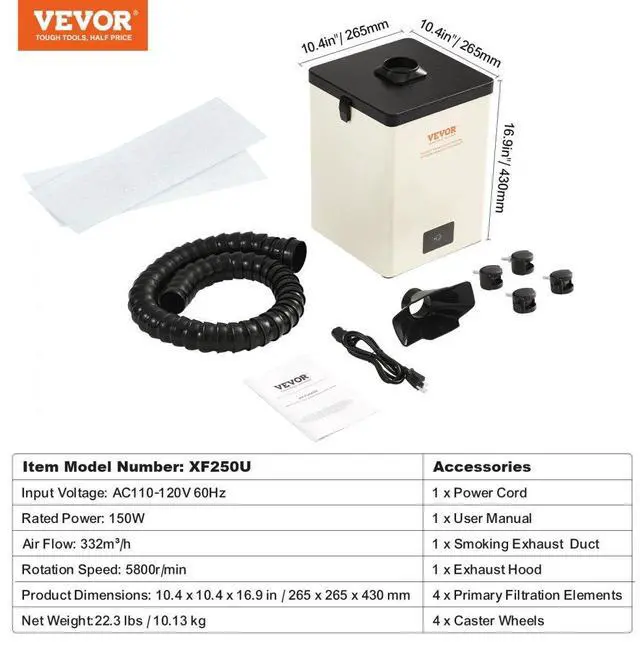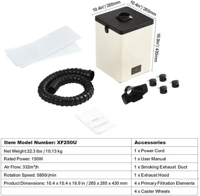 Air Flow: 332m³/h,Item Model Number: XF250U,Input Voltage: AC110-120V 60Hz,Rated Power: 150W,Low Noise Level: 70 dB,Product Dimensions: 10.4 x 10.4 x 16.9 in / 265 x 265 x 430mm,Net Weight: 22.3 lbs / 10.13 kg,Rotation Speed: 5800r/min