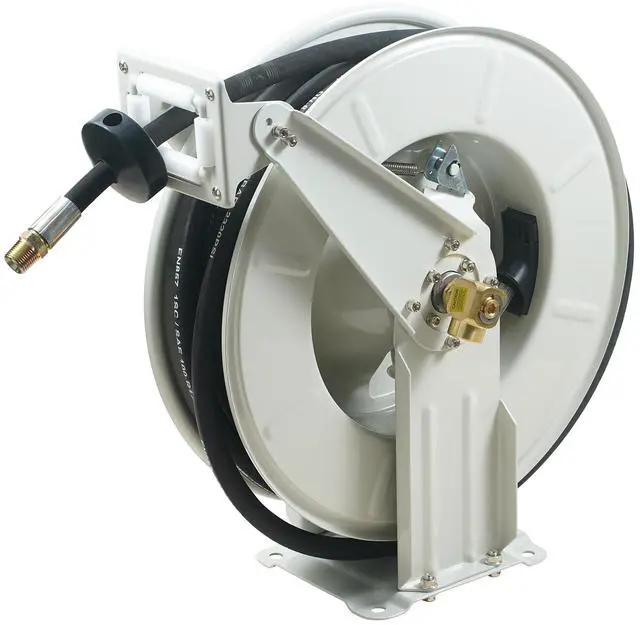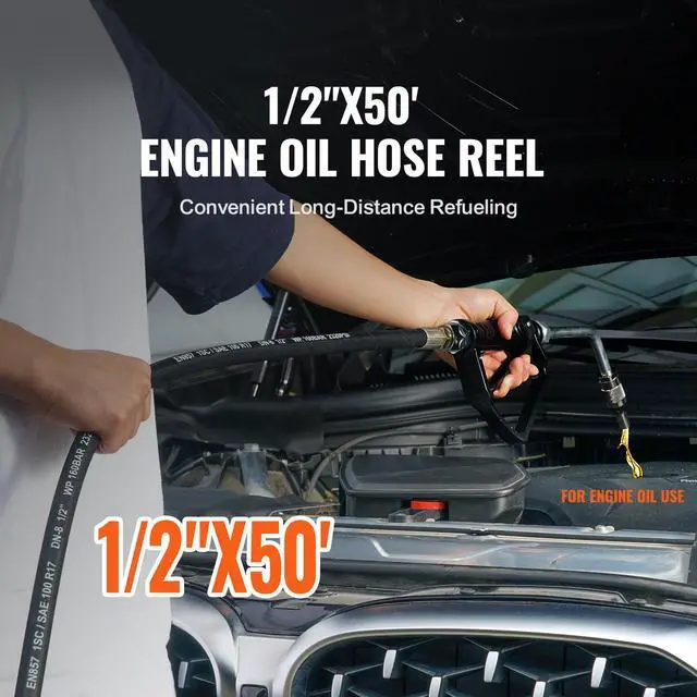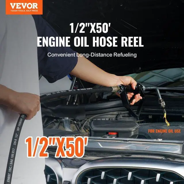VEVOR Fuel Hose Reel, 1/2" x 50', Extra Long Retractable Machine Oil Hose Reel, Spring Driven Auto Swivel Rewind, Heavy-Duty Carbon Steel Construction with Hose for Auto Repair, Industries, 2300 PSI