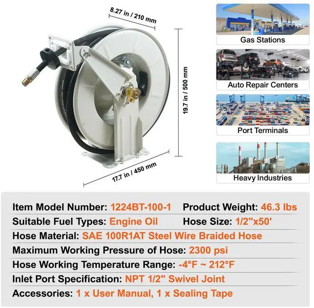 Inlet Port Specification: NPT 1/2",Working Temperature: -4 to 212/ -20 to 100,Item Model Number: 1224BT-100-1,Product Weight: 46.3 lbs/21.02 kg,Hose Size: 1/2" x 50',Suitable Fuel Types: Machine Oil,Max Working Pressure: 2300 psi,Product Size: 17.7" x 8.27" x 19.7"/450 x 210 x 500 mm