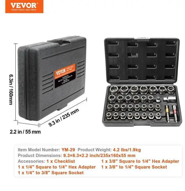 VEVOR Bolt Extractor Set, 29-Piece Bolt and Nut Remover Set, 6mm to 10mm, 13/32" to 3/4", CR-MO Steel Extraction Socket Set with Storage Case, for Removing Damaged Rusted Bolts, Nuts and Screws