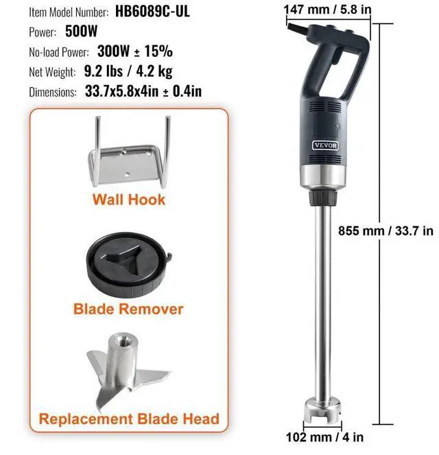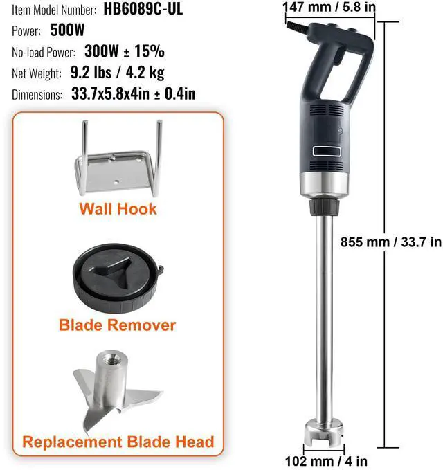 VEVOR Commercial Immersion Blender, 500 Watt Heavy Duty Hand Mixer, Variable Speed Kitchen Stick Mixer with 304 Stainless Steel Blade, Multi-Purpose Portable Mixer for Soup, Smoothie, Puree, Baby Food