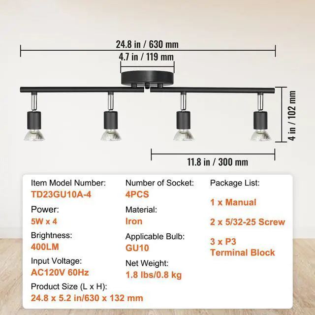 Number of Socket: 4PCS,Brightness: 400LM,Product Size (L x H): 24.8 x 5.2 in/630 x 132 mm,Item Model Number: TD23GU10A-4,Input Voltage: AC120V 60Hz,Material: Iron,Net Weight: 1.8 lbs/0.8 kg,Power: 4W x 4,Applicable Bulb: GU10
