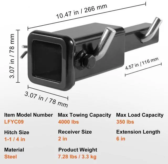 Extension Length: 6",Hitch Size: 1-1/4",Max Towing Capacity: 4000 lbs,Item Model Number: LFYC09,Product Weight: 7.28 lbs/3.3 kg,Max Load Capacity: 350 lbs,Material: Steel,Receiver Size: 2",Product Size: 10.47 x 3.07 x 3.07 in/266 x 78 x 78 mm