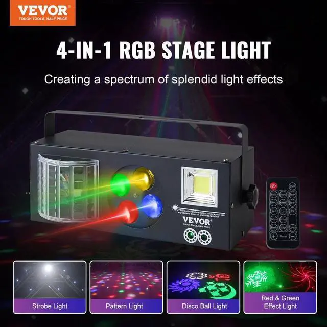 VEVOR Stage Lights, 4 in 1 RGB Party Lights, LED Pattern Strobe Light, Mixed Lighting Effects Sound Activated with Red & Green Effect Light for DJ Club Disco Party Wedding Birthday Christmas (Black)