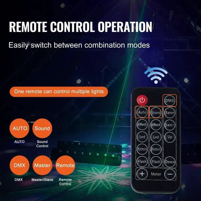 Operation Modes: AUTO, Sound Control, DMX, Master/Slave, Remote Control,Voltage/Frequency: AC120V/60Hz,Exposed Wire Length: 55.1"/1400 mm,Light Sources: Strobe/Pattern/Disco Ball/Red & Green Effect Light,Item Model Number: JM-L38,Product Weight: 4.96 lbs/2.25 kg,Rated Power: 30W,Material: ABS + Iron,Lifespan: 50,000 hours,Product Size: 15.7" x 7.9" x 6.7"/400 x 200 x 170 mm