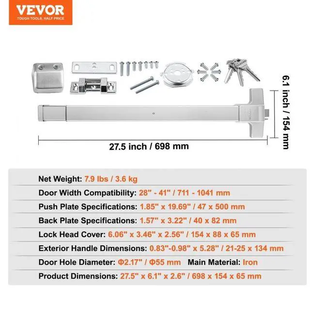 Lock Head Cover: 6.06" x 3.46" x 2.56" / 154 x 88 x 65 mm,Door Hole Diameter: 2.17" / 55 mm,Item Model Number:500P,Push Plate Specifications: 1.85" x 19.69" / 47 x 500 mm,Door Width Compatibility: 28" - 41" / 711 - 1041 mm,Product Dimensions: 27.5" x 6.1" x 2.6" / 698 x 154 x 65 mm,Back Plate Specifications: 1.57" x 3.22" / 40 x 82 mm,Net Weight: 7.9 lbs / 3.6 kg,Main Material: Iron,Exterior Handle Dimensions: 0.83"-0.98" x 5.28" / 21-25 x 134 mm