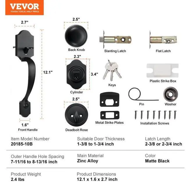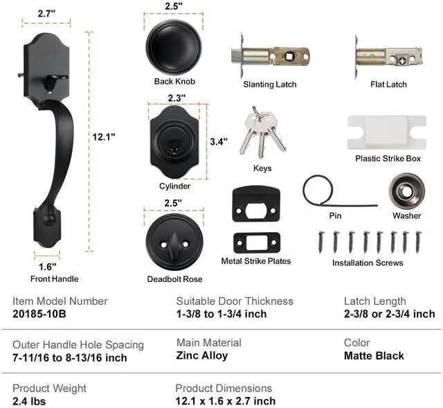 Suitable Door Thickness: 1-3/8 to 1-3/4 inches (35-45 mm),Latch Length: 2-3/8 or 2-3/4 inches (60/70 mm),Color: Matte Black,Item Model Number: 20185-10B,Product Weight: 2.4 lbs / 1.1 kg,Main Material: Zinc Alloy,Outer Handle Hole Spacing: 7-11/16 to 8-13/16 inches (195-224 mm)