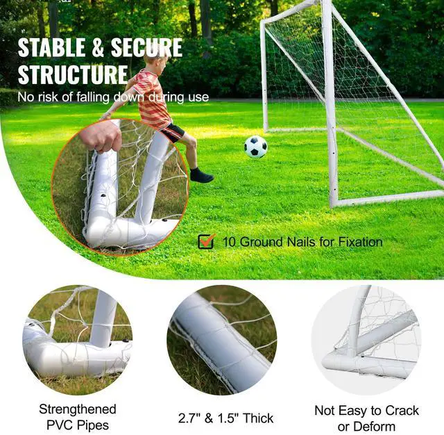 Stable & Secure Structure: Our portable soccer goal is built for stability and security. The strengthened PVC pipes used in its construction are resistant to cracking and deformation, ensuring the goal's longevity. Additionally, we provide 10 ground nails for fixation, allowing you to anchor the goal securely to the ground, even during the most intense matches