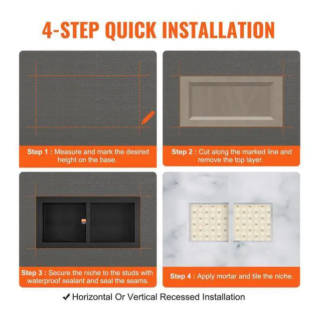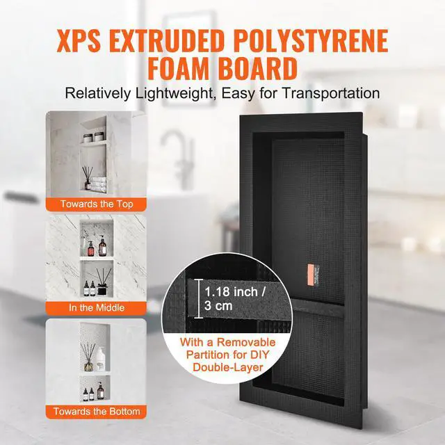 VEVOR Shower Niche Ready for Tile 16" x 32", Double Shelf Organizer, Square Corners Wall-inserted Niche Recessed, Sealed Protection Modern Soap Storage Niche for Shower Bathroom, Black