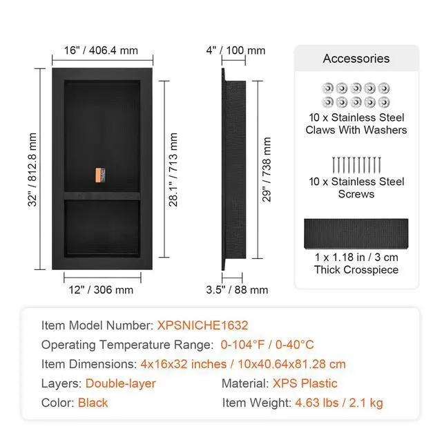 Operating Temperature Range: 0-104°F / 0-40°C,Color: Black,Item Model Number: XPSNICHE1632,Item Dimensions: 4x16x32 inches / 10x40.64x81.28 cm,Material: XPS Plastic,Layers: Double-layer,Item Weight: 4.63 lbs / 2.1 kg