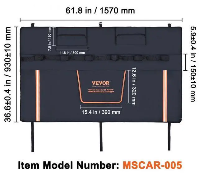 Webbing Size: 15×1.5 inch/380×38 mm,Capacity: 6 Bikes,Item Model Number: MSCAR-005,Applicable Vehicle Type: Truck Bed Width61.8 inch/1570 mm,Pre-opening Window: 15.4×12.6 inch/390×320 mm,Material: PVC+Sponge+Crystal Velvet,Net Weight: 3.6 lbs/1.65 kg,Pocket Size:11.8×7.5 inch/300×190 mm,Product Size: 61.8×36.6 inch/1570×930 mm
