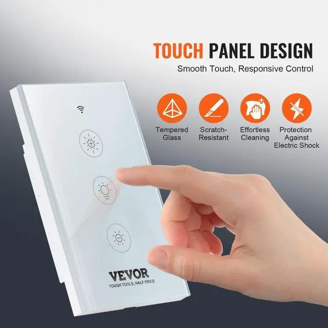 VEVOR WiFi Smart Light Dimmer Switch, 100-250V AC Wi-Fi 2.4GHz, 15% to 85% Stepless Dimming LED Dimmable Smart Switch with Touch Panel, App Remote Control Voice Compatible with Alexa Google Home