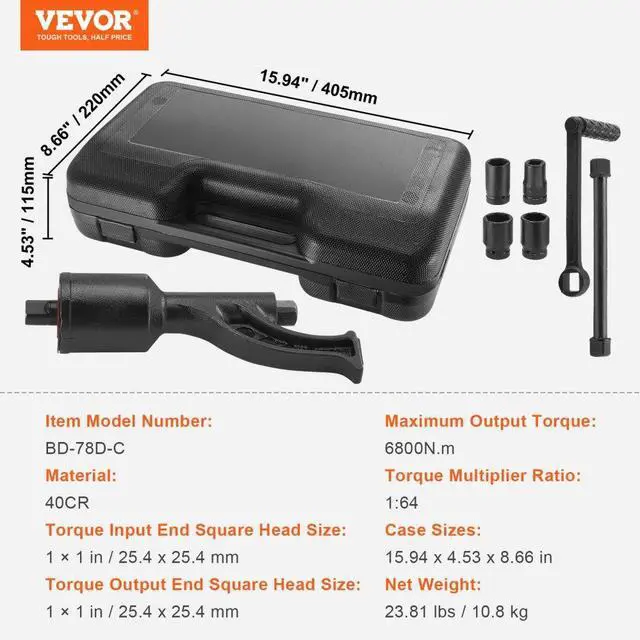 Torque Multiplier Ratio: 1:64,Case Sizes : 15.94 x 4.53 x 8.66in / 405 x 115 x 220mm,Torque Output End Square Head Size: 1"/25.4x25.4mm,Maximum Output Torque: 6800N.m,Torque Input End Square Head Size: 1"/25.4x25.4mm,Item Model Number: BD-78D-C,Surface Treatment: Spray Coating,Material: High-Quality Alloy Steel,Net Weight: 23.81lbs / 10.8kg