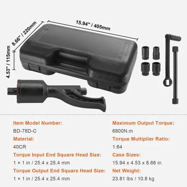 Torque Multiplier Ratio: 1:64,Case Sizes : 15.94 x 4.53 x 8.66in / 405 x 115 x 220mm,Torque Output End Square Head Size: 1"/25.4x25.4mm,Maximum Output Torque: 6800N.m,Torque Input End Square Head Size: 1"/25.4x25.4mm,Item Model Number: BD-78D-C,Surface Treatment: Spray Coating,Material: High-Quality Alloy Steel,Net Weight: 23.81lbs / 10.8kg