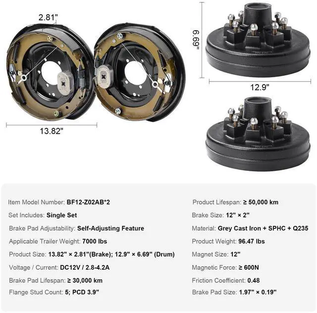 Product Lifespan: 50,000 km,Brake Pad Lifespan: 30,000 km,Set Includes: Single Set (2 Brakes + 2 Brake Drums),Material: Grey Cast Iron + SPHC + Q235,Brake Pad Adjustability: Self-Adjusting Feature,Magnetic Force: 600N,Applicable Trailer Weight: 7000 lbs,Magnet Size: 12",Friction Coefficient: 0.48,Brake Size: 12" x 2",Product Size: 13.82" x 2.81" (Brake); 12.9" x 6.69" (Drum),Flange Stud Count: 5,Item Model Number: BF12-Z02AB*2,Product Weight: 96.47 lbs,Voltage/Current: DC12V/2.8-4.2A,Brake Pad Size: 1.97" x 0.19"