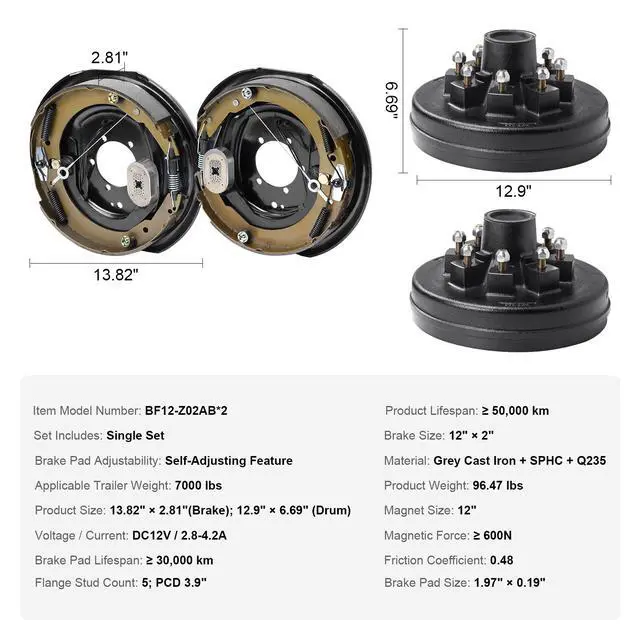 Product Lifespan: 50,000 km,Brake Pad Lifespan: 30,000 km,Set Includes: Single Set (2 Brakes + 2 Brake Drums),Material: Grey Cast Iron + SPHC + Q235,Brake Pad Adjustability: Self-Adjusting Feature,Magnetic Force: 600N,Applicable Trailer Weight: 7000 lbs,Magnet Size: 12",Friction Coefficient: 0.48,Brake Size: 12" x 2",Product Size: 13.82" x 2.81" (Brake); 12.9" x 6.69" (Drum),Flange Stud Count: 5,Item Model Number: BF12-Z02AB*2,Product Weight: 96.47 lbs,Voltage/Current: DC12V/2.8-4.2A,Brake Pad Size: 1.97" x 0.19"