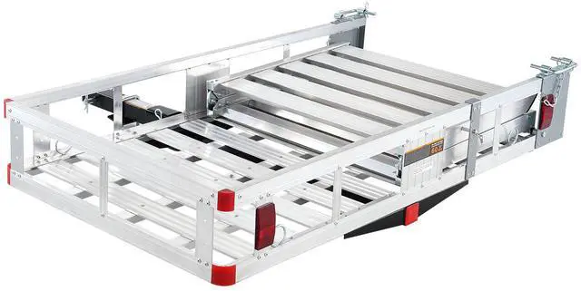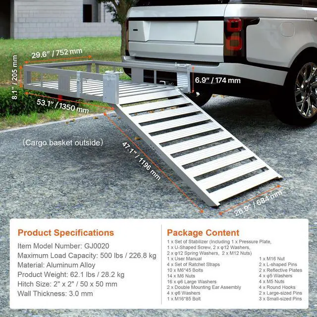 Ramp Dimensions: 47.1" x 27.2" x 2" / 1196 x 692 x 50 mm,Hitch Size: 2" x 2" / 50 x 50 mm,Item Model Number: GJ0020,Maximum Load Capacity: 500 lbs / 226.8 kg,Product Weight: 62.1 lbs / 28.2 kg,Material: Aluminum Alloy,Wall Thickness: 3.0mm,Cargo Basket Dimensions: 53.3" x 29.7" x 8.1" / 1355 x 755 x 205 mm