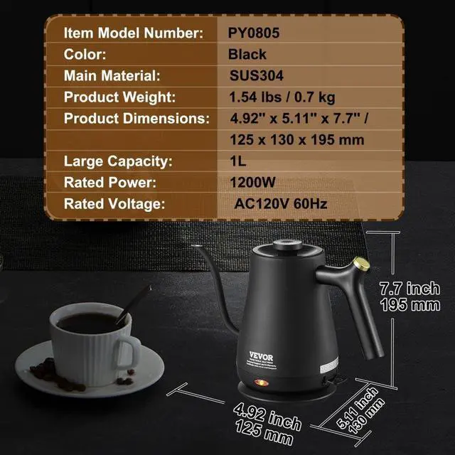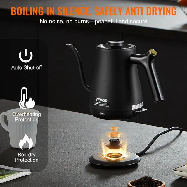 VEVOR 1L Electric Gooseneck Kettle, 1200W Fast Heating Gooseneck Pour Over Coffee Tea Kettle, 304 Food Grade Stainless Steel Hot Water Boiler Heater with Boil-Dry Protection, Auto Shut-off