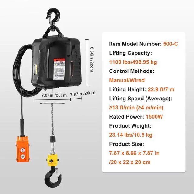 Lifting Height: 22.9 ft/7 m,Lifting Speed (Average): 13 ft/min (4 m/min),Lifting Capacity: 1100 lbs/498.95 kg,Item Model Number: 500-C,Product Weight: 23.14 lbs/10.5 kg,Rated Power: 1500W,Control Methods: Manual/Wired,Product Size: 7.87 x 8.66 x 7.87 in/20 x 22 x 20 cm