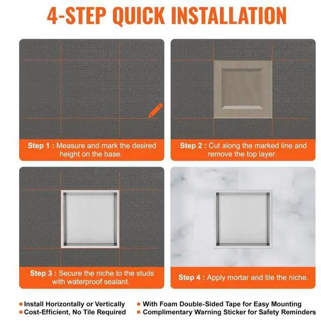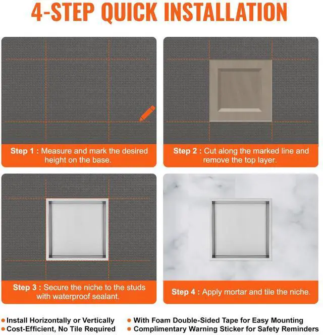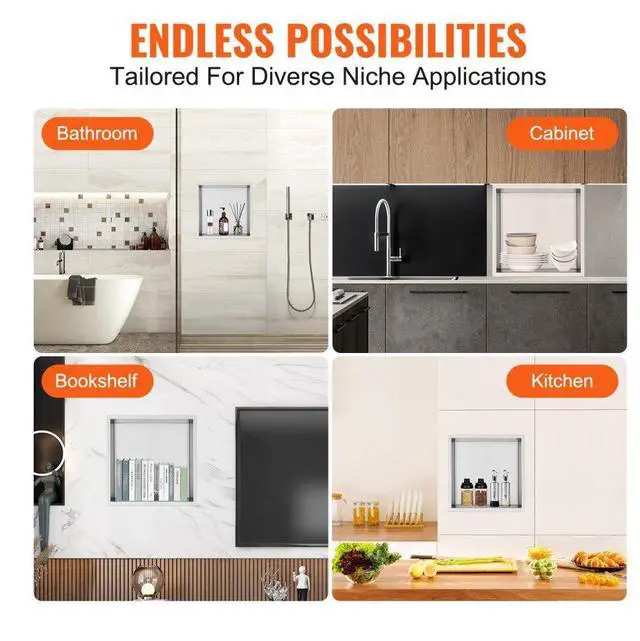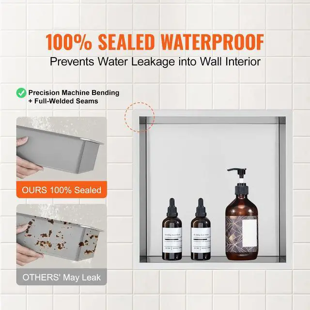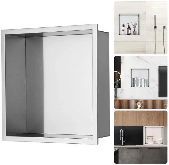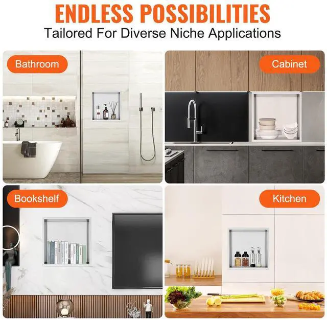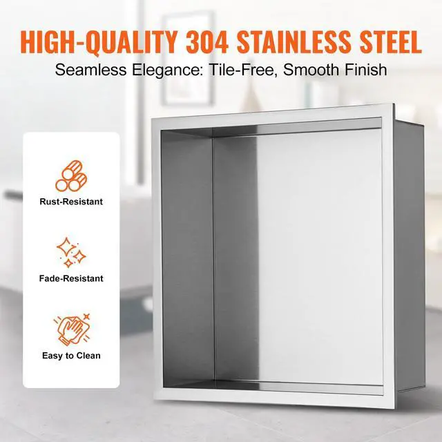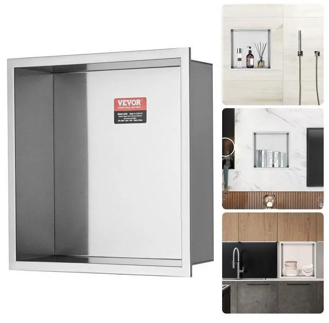 VEVOR 13"x13" No Tile Shower Niche 304 Stainless Steel, Wall-Inserted Niche Recessed Double Shelves, Sealed Waterproof Rust-Resistant Modern Niche for Shower Bathroom Soap Storage, Silver