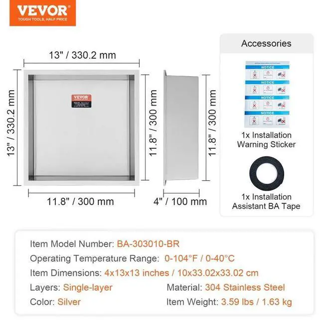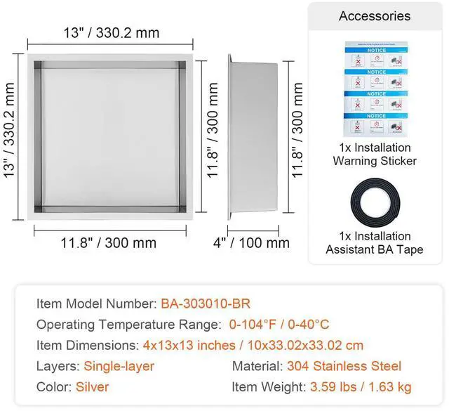 Operating Temperature: 0-104°F / 0-40°C,Color: Silver,Item Model Number: BA-303010-BR,Shelf: Single-layer,Dimensions: 4x13x13 inches / 10x33.02x33.02 cm,Material: 304 Stainless Steel,Item Weight: 3.59 lbs / 1.63 kg