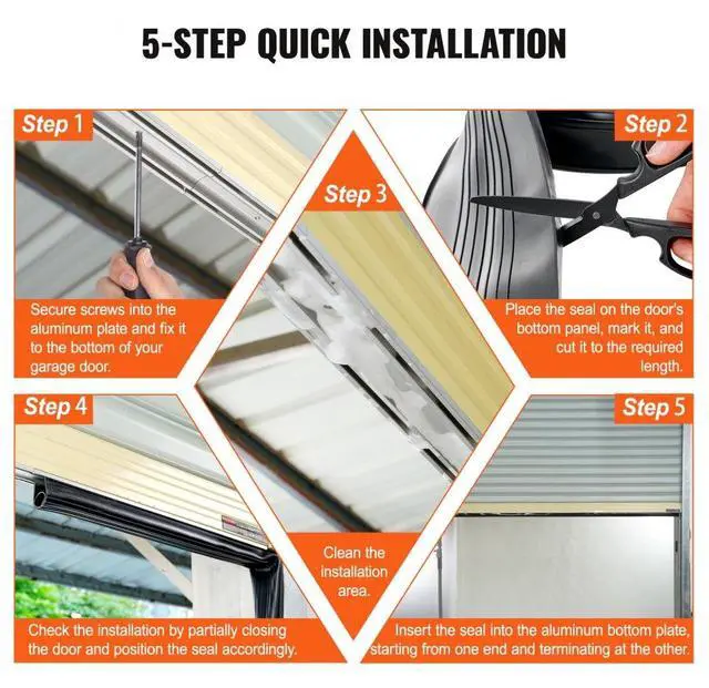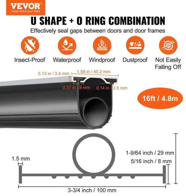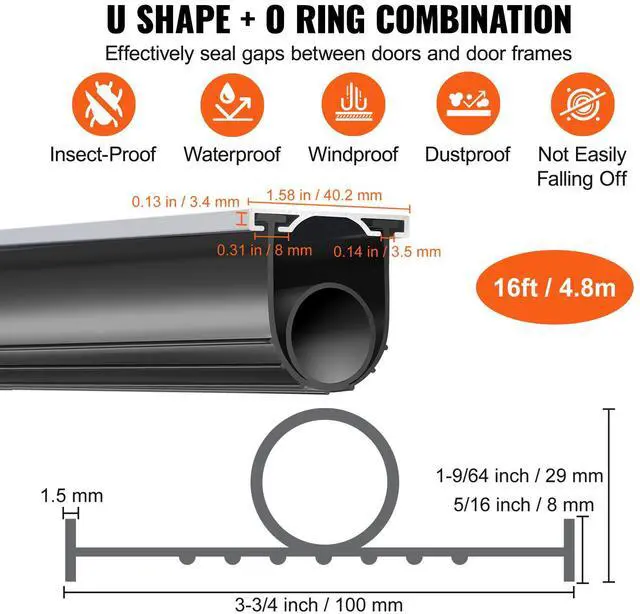VEVOR Garage Door Seals Bottom Rubber, U Shape +O Ring Combination Garage Door Weather Stripping with Pre-drilled Aluminum Track Retainer Kit, 5/16 inch T-ends and 3 3/4 inch Width (16 Ft, Black)