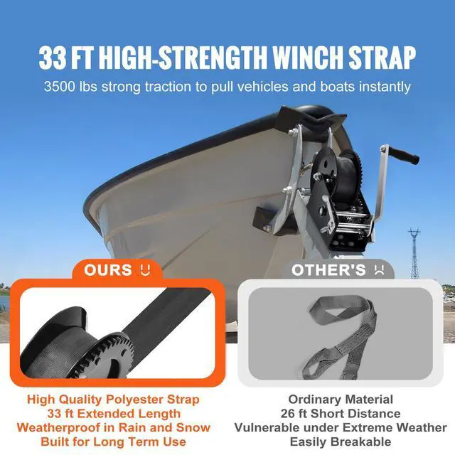 VEVOR Hand Winch, 3500 lbs Pulling Capacity, Boat Trailer Winch Heavy Duty Rope Crank with 33 ft Polyester Strap and Two-Way Ratchet, Manual Operated Hand Crank Winch for Trailer, Boat or ATV Towing