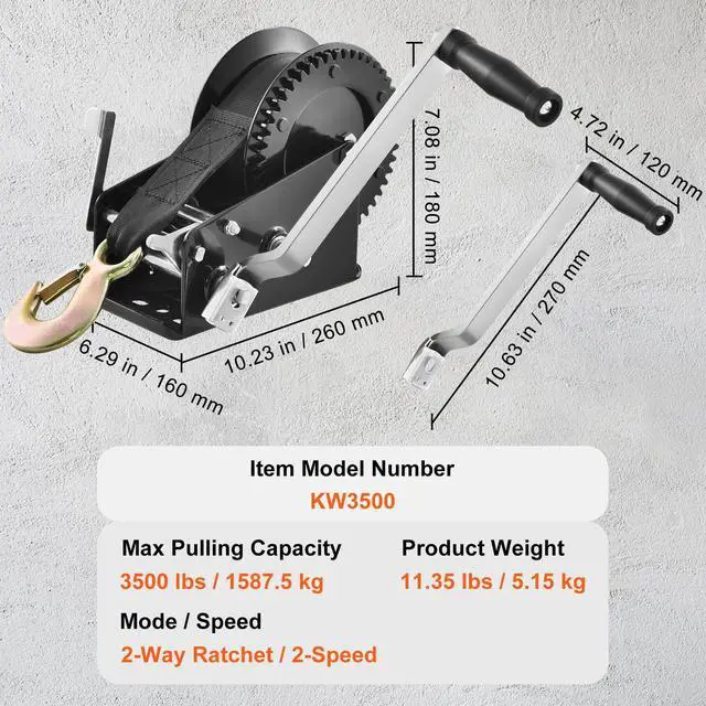 Handle Size: 10.63 x 4.72 in/270 x 120 mm,Max Pulling Capacity: 3500 lbs/1587.5 kg,Item Model Number: KW3500,Product Weight: 11.35 lbs/5.15 kg,Mode/Speed: 2-Way Ratchet/2-Speed,Product Size: 10.23 x 6.29 x 7.08 in/260 x 160 x 180 mm