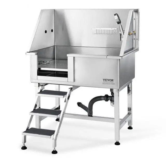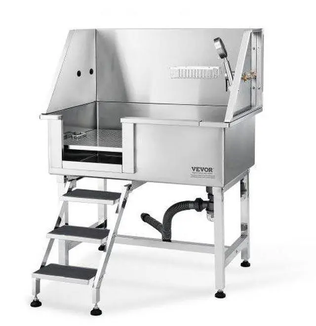 • VEVOR 38" Pet Dog Bathing Station w/Ramp, Professional Stainless Steel Dog Grooming Tub w/ Storage Drawer, Floor Grate, Faucet, Dog Bathtub for Large,Medium,Small Pets, Washing Sink for Home(Left)