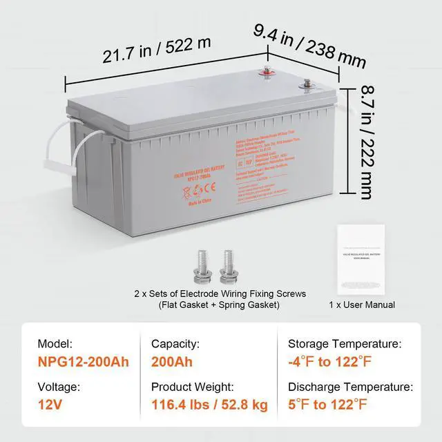 Capacity: 200Ah,Voltage: 12V,Item Model Number: NPG12-200Ah,Product Weight: 116.4 lbs / 52.8 kg,Product Dimensions: 21.7 x 9.4 x 8.7 in / 522 x 238 x 222 mm,Discharge Temperature: 5 to 122,Storage Temperature: -4 to 122