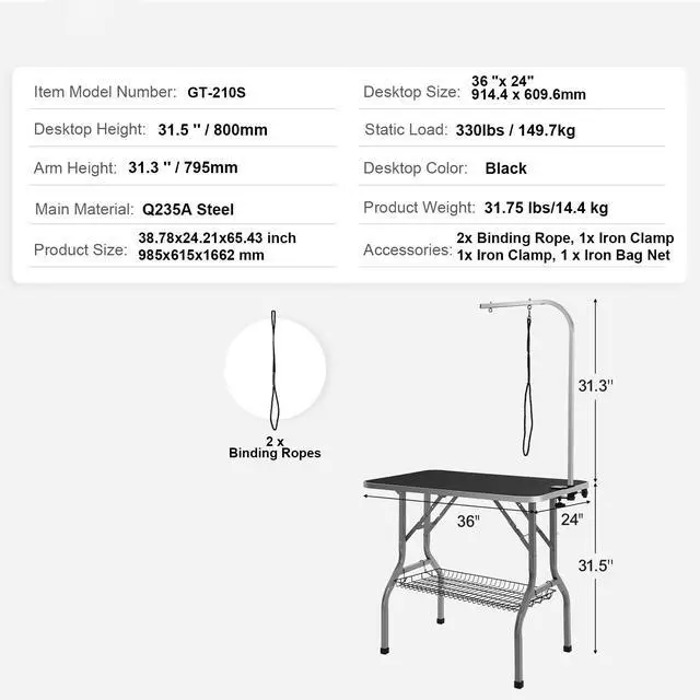 Desktop Height: 31.5 '' / 800mm,Desktop Size: 36 "x 24" / 914.4 x 609.6mm,Static Load Capacity: 330lbs / 149.7kg,Model: GT-210S,Product Weight: 31.75 lbs/14.4 kg,Main Material: Q235A Steel,Arm Height: 31.3 '' / 795mm,Desktop Color: Black,Product Size: 38.78x24.21x65.43 inch / 985x615x1662 mm