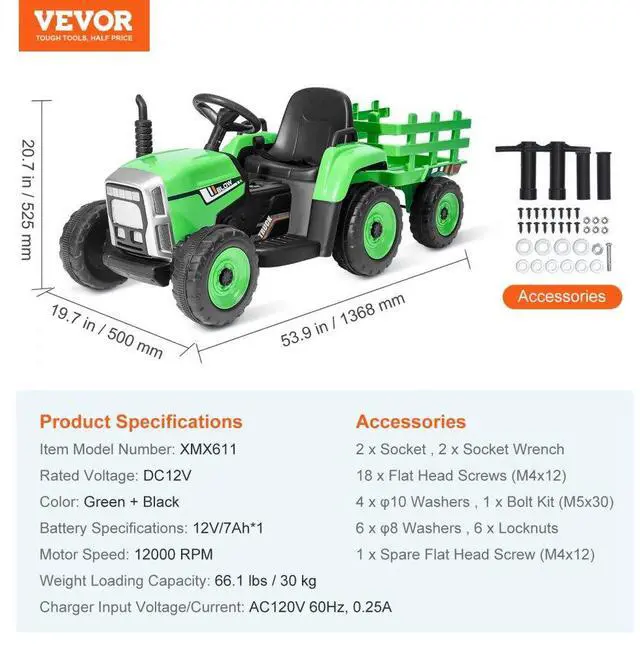 Motor Speed: 12000 RPM,Charger Input Voltage/Current: AC120V 60Hz, 0.25A,Color: Green + Black,Item Model Number: XMX611,Battery Specifications: 12V/7Ah*1,Product Dimensions: 53.9 x 19.7 x 20.7 in / 1368 x 500 x 525 mm,Rated Voltage: DC12V,Weight Loading Capacity: 66.1 lbs / 30 kg