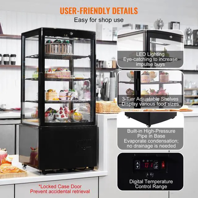 VEVOR Refrigerated Display Case, 3 Cu.Ft./85L Countertop Pastry Display Case, 3-Tier Commercial Display Refrigerator with LED Lighting, TURBO Cooling, Frost-Free Air-Cooling, Locked Door for Bakery