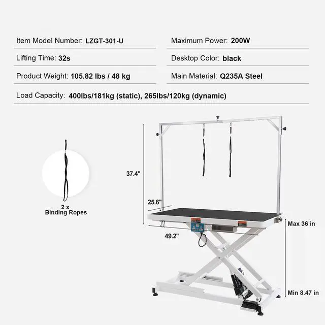 Desktop Height: 8.47 '' -36 '' / 215-914.4 mm,Lifting Time: 32s,Desktop Size: 49.2 '' x 25.6 '' / 1249.7 x 650 mm,Maximum Power: 200W,Input Power Supply: 100-240V 50-60Hz,Load Capacity: 400lbs/181kg (static), 265lbs/120kg (dynamic),Model: LZGT-301-U,Product Weight: 105.82 lbs / 48 kg,Main Material: Q235A Steel,Arm Height: 37.4 '' / 950,Desktop Color: black,Product Size: 55.75x25.60x42.72 inch / 1416x650x1085 mm