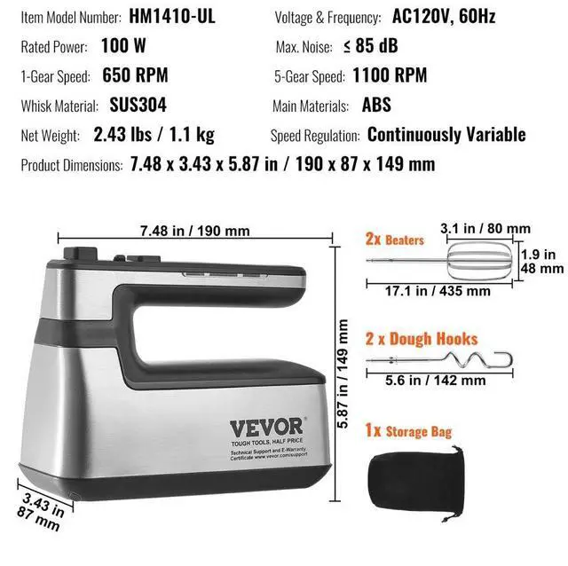 Main Materials: ABS,Speed Regulation: Continuously Variable,Whisk Material: SUS304,Item Model Number: HM1410,1-Gear Speed: 650 RPM,Rated Power: 100 W,Voltage & Frequency: AC120V, 60Hz,5-Gear Speed: 1100 RPM,Product Dimensions: 7.48 x 3.43 x 5.87 in / 190 x 87 x 149 mm,Net Weight: 2.43 lbs / 1.1 kg,Max. Noise: 85 dB