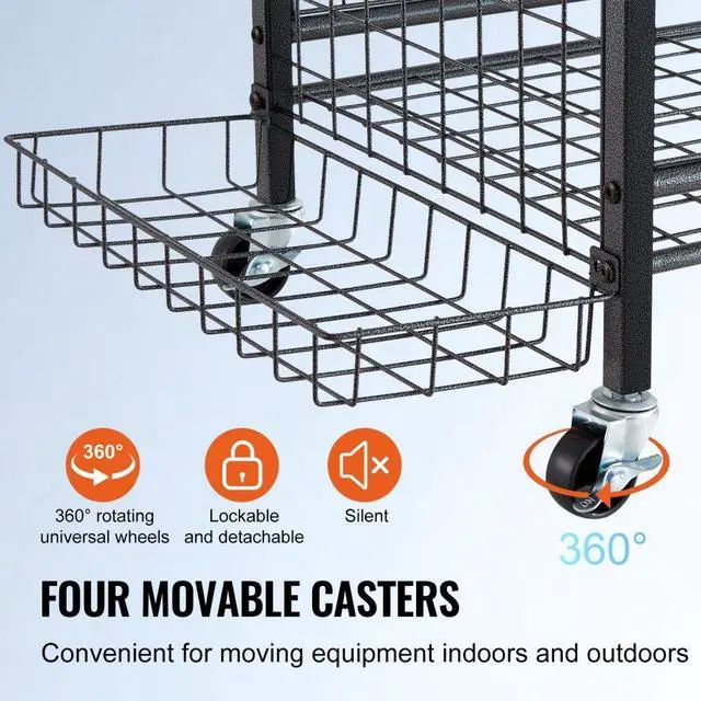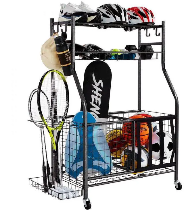 VEVOR Sports Equipment Garage Organizer, Rolling Ball Storage Cart on Wheels, Basketball Rack with Baskets & Hooks, Indoor/Outdoor Sports Gear and Toys Storage, Steel Sports Equipment Organizer, Black