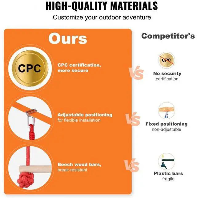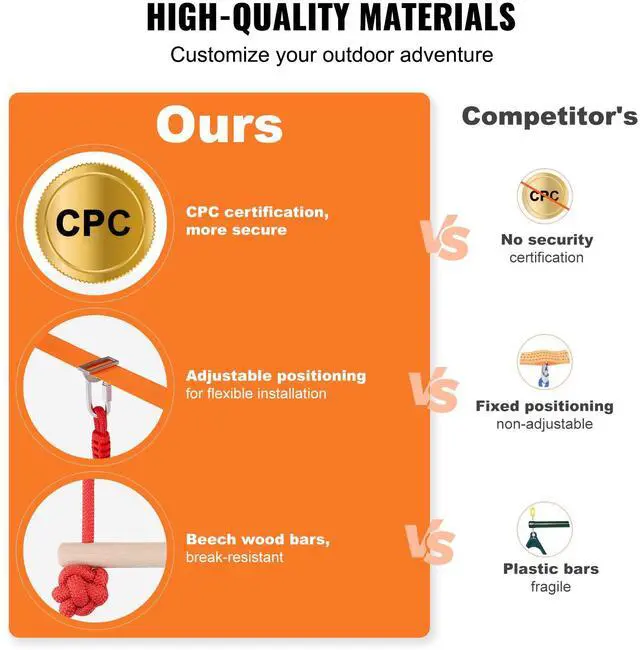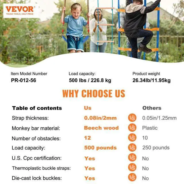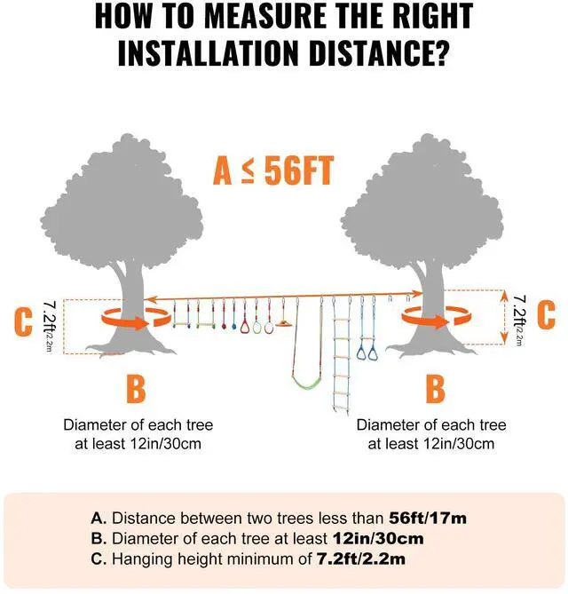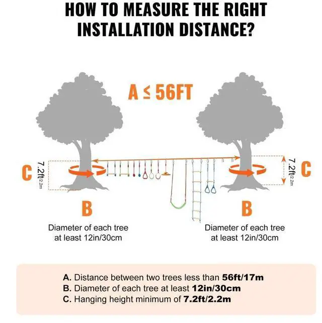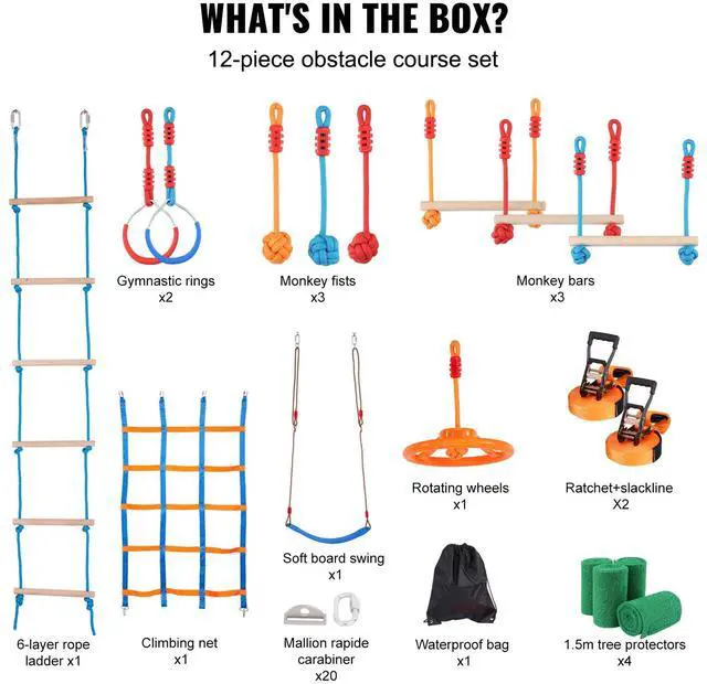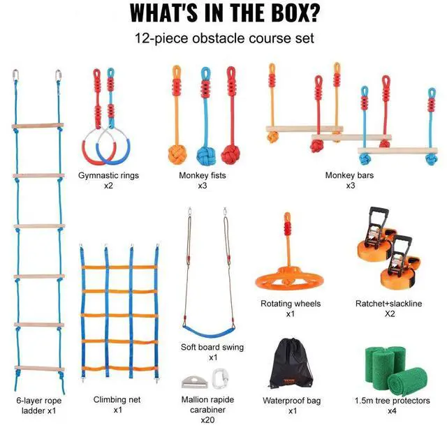 • VEVOR Ninja Warrior Obstacle Course for Kids, 2 x 56 ft Weatherproof Slacklines, 500lbs Weight Capacity Monkey Line, Outdoor Playset Equipment, Backyard Toys Training Equipment Set with 12 Obstacles