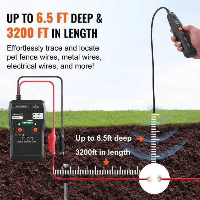 VEVOR Underground Cable Locator, 6.5 FT Max. Detection Depth, Wire Tracer Break Detector Finder with Earphone, 3280 FT Max.Detection Length Cable Tester for Pet Fence Buried Sprinkler Valve Irrigation