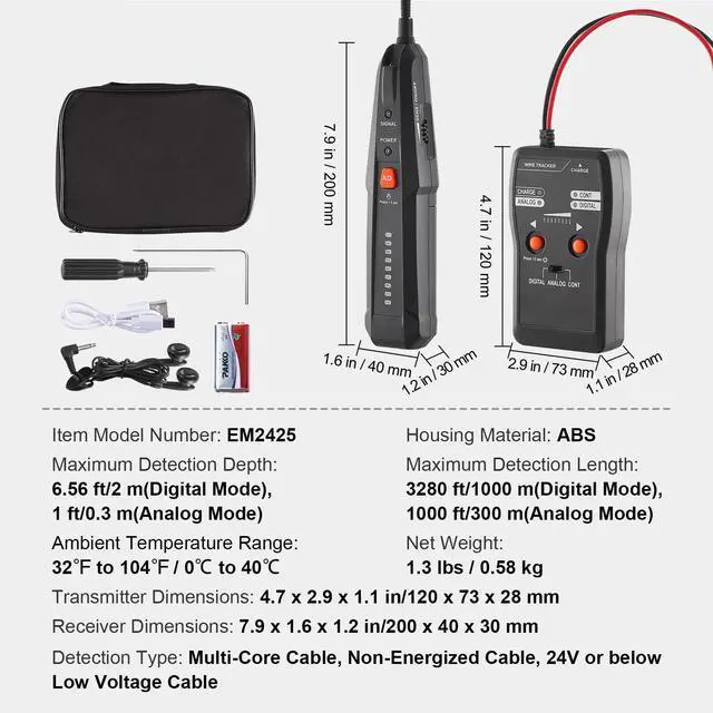 Detection Types: Multi-Core Cable, Non-Energized Cable, 24V or below Low Voltage Cable(in digital mode only),Housing Material: ABS,Ambient Temperature Range: 32 to 104/0 to 40,Transmitter Dimensions: 4.7 x 2.9 x 1.1 in/120 x 73 x 28 mm,Item Model Number: EM2425,Maximum Detection Depth: 6.56 ft/2 m(Digital Mode), 1 ft/0.3 m(Analog Mode),Maximum Detection Length: 3280 ft/1000 m(Digital Mode), 1000 ft/300 m(Analog Mode),Net Weight: 1.3 lbs /0.58 kg,Receiver Dimensions: 7.9 x 1.6 x 1.2 in/200 x 40 x 30 mm