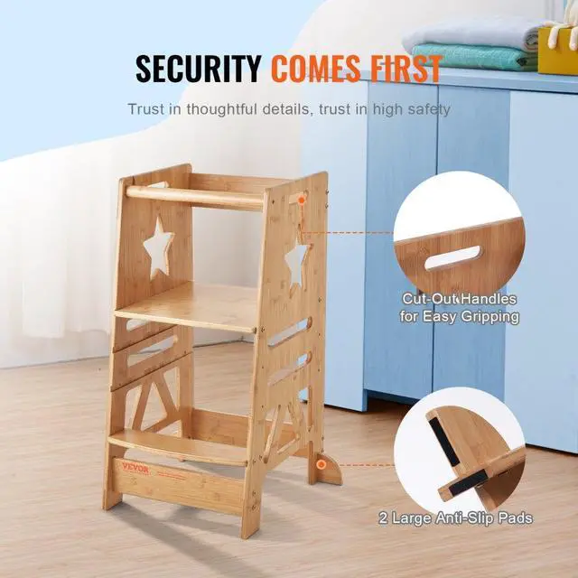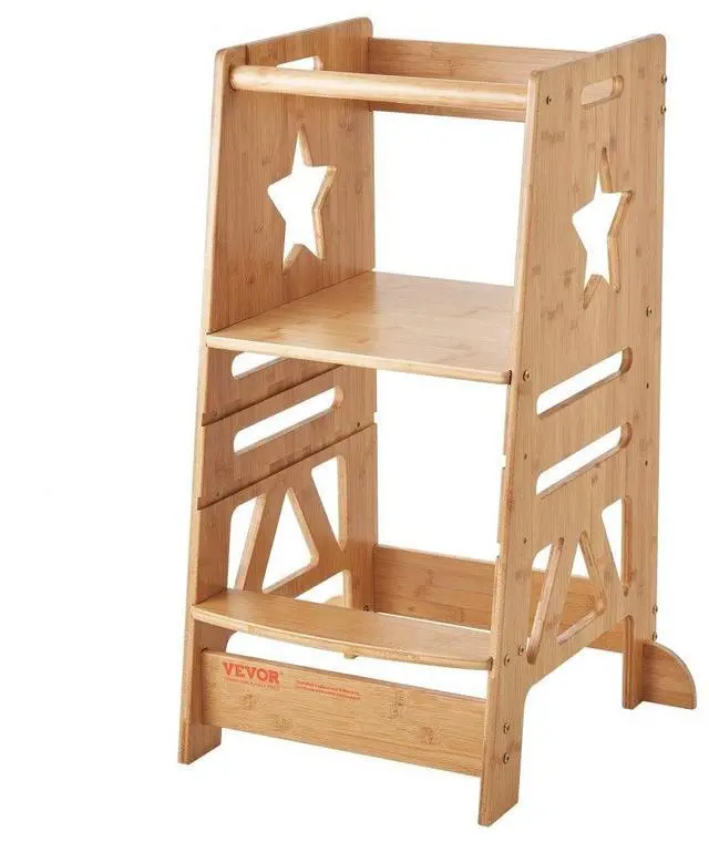 VEVOR Tower Step Stool, 3-Level Height Adjustable Toddler Step Stools for Kids, Bamboo Kids Standing Tower Learning Stool with Safety Rail for Kitchen Counter Bathroom, 350LBS