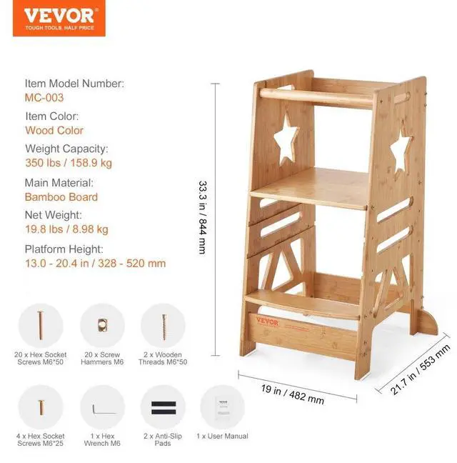 Weight Capacity: 350 lbs / 158.9 kg,Item Color: Wood Color,Item Model Number: MC-003,Platform Height: 13.0 - 20.4 in / 328 - 520 mm,Product Dimensions: 33.3 x 21.7 x 19.0 in / 844 x 553 x 482 mm,Net Weight: 19.8 lbs / 8.98 kg,Main Material: Bamboo Board