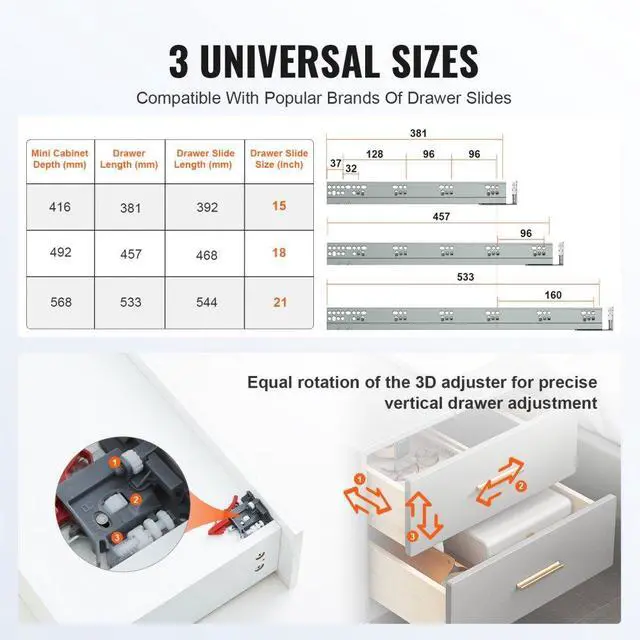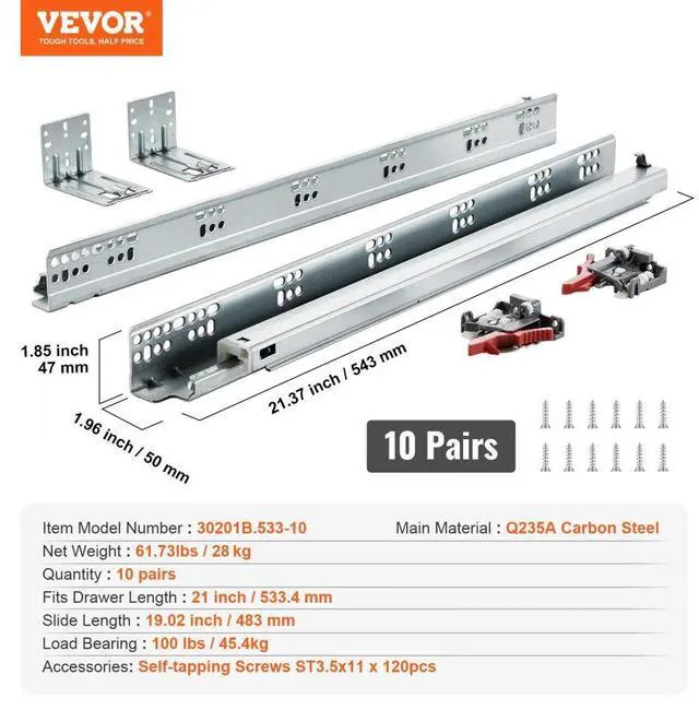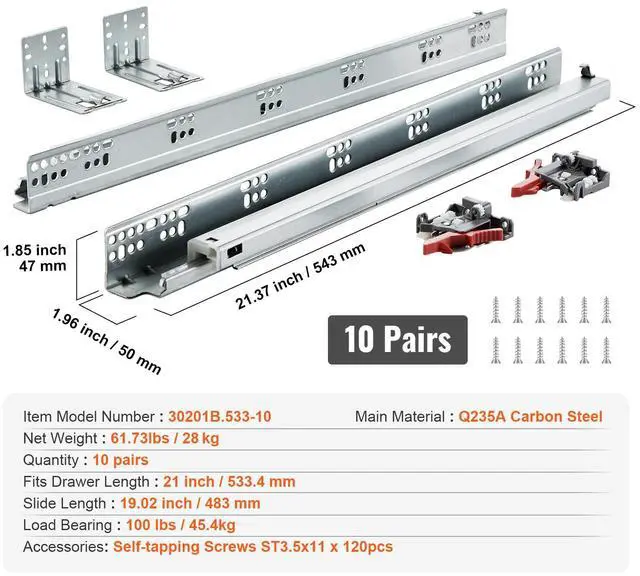 Fits Drawer Length: 21 inch / 533.4 mm,Model: 30201B.533-10,Static Load Bearing: 100 lbs / 45.4 kg,Dynamic Load Bearing: 80 lbs / 36.3 kg,Quantity: 10pcs,Product Dimensions: 21.54 x 2.4 x 2.13 inch /547 x 61 x 54mm,Main Material: Carbon Steel
