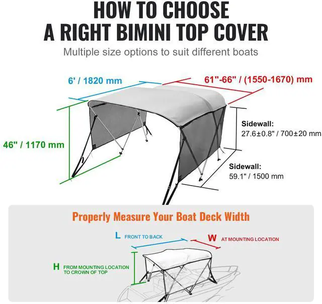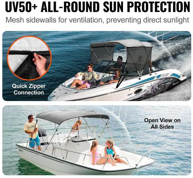 VEVOR 3 Bow Bimini Top Boat Cover, Detachable Mesh Sidewalls, 600D Polyester Canopy with 1" Aluminum Alloy Frame, Includes Storage Boot, 2 Support Poles, 2 Straps, 6'L x 46"H x 61"-66"W, Light Grey