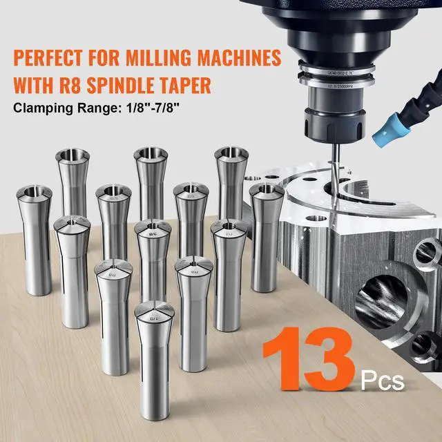 VEVOR 13 pcs Precision R8 Collet Set, 1/8'' - 7/8'', 45# Alloy Steel Mill Collet Chuck 0.0012"/30m TIR with 13 Labeled Storage Boxes, for Milling Machine Drill Presses Boring Machine Machining Center