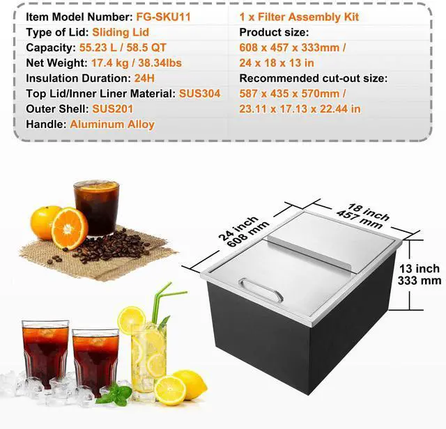Top Lid/Inner Liner Material: SUS304,Capacity: 55.23L / 58.5QT,Item Model Number: FG-SKU11,Outer Shell: SUS201,Insulation Duration: 24H,Net Weight: 17.4 kg / 38.34 lbs,Handle: Aluminum Alloy