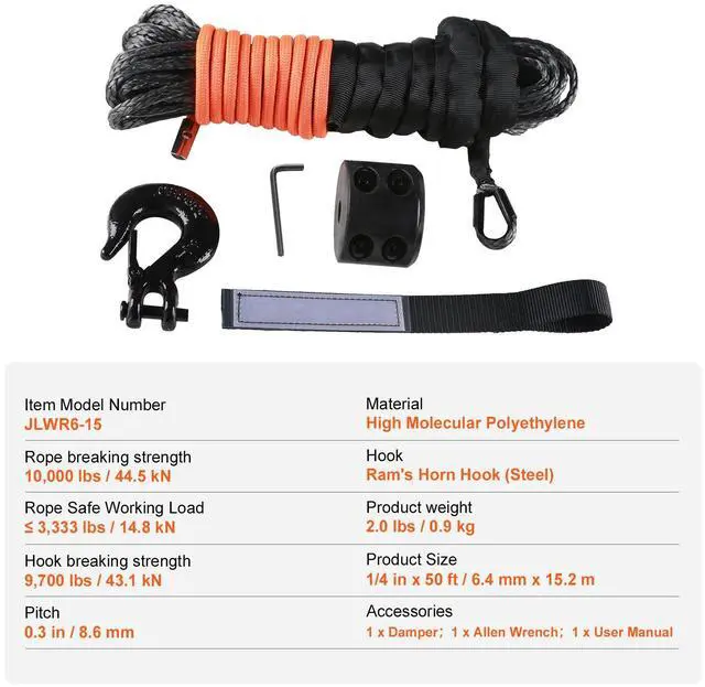 Rope Safe Working Load: 3,333 lbs / 14.8 kN,Hook: Ram's Horn Hook (Steel),Rope Breaking Strength: 10,000 lbs / 44.5 kN,Hook Breaking Strength: 9,700 lbs / 43.1 kN,Item Model Number: JLWR6-15,Pitch: 0.3 in / 8.6 mm,Product Weight: 2.0 lbs / 0.9 kg,Material: High Molecular Polyethylene,Product Size: 1/4 in x 50 ft / 6.4 mm x 15.2 m