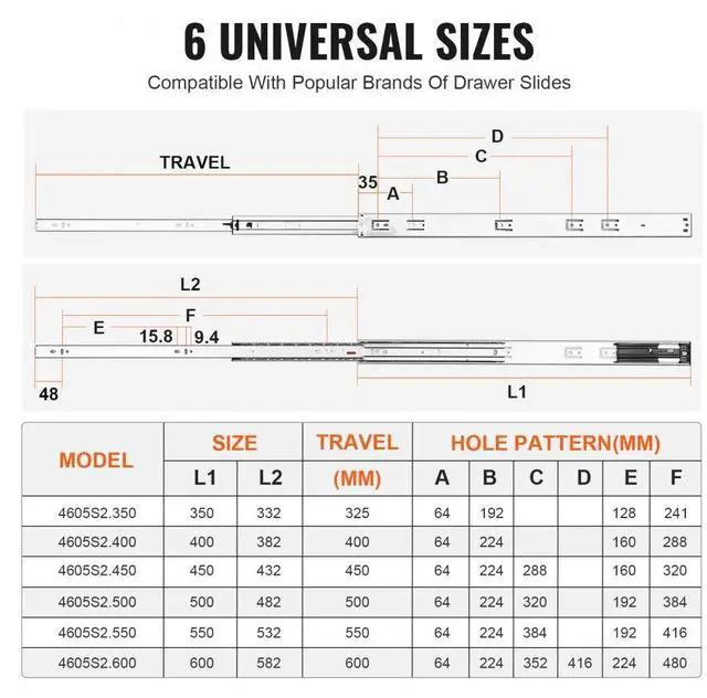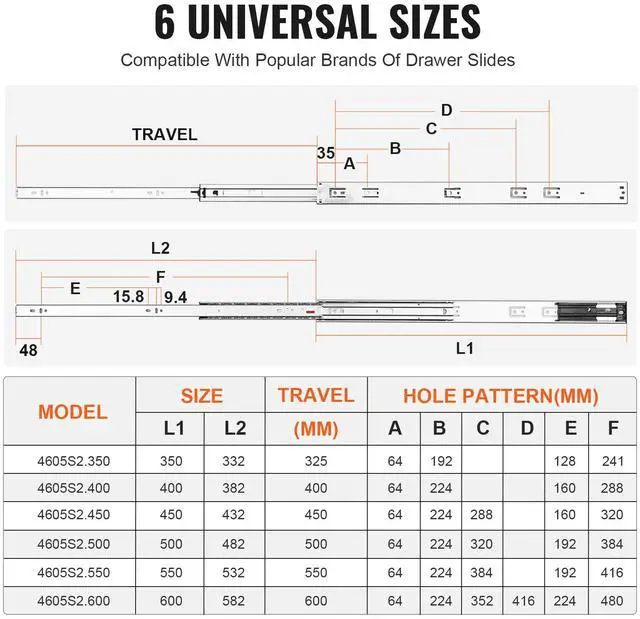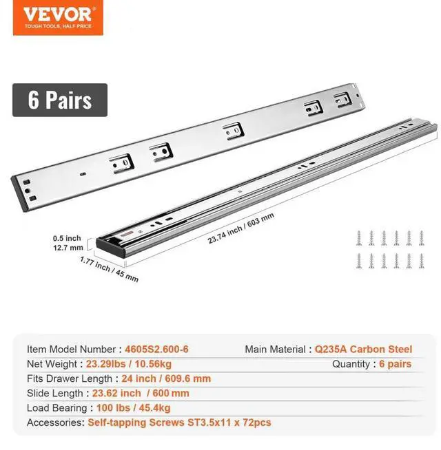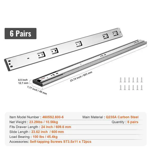 Fits Drawer Length: 24 inch / 609.6 mm,Model: 4605S2.600-6,Load Bearing: 100lbs / 45.4kg,Quantity: 6pcs,Product Dimensions: 23.74 X 1.77 X 0.5inch / 603 x 45 x 12.7 mm,Main Material: Carbon Steel